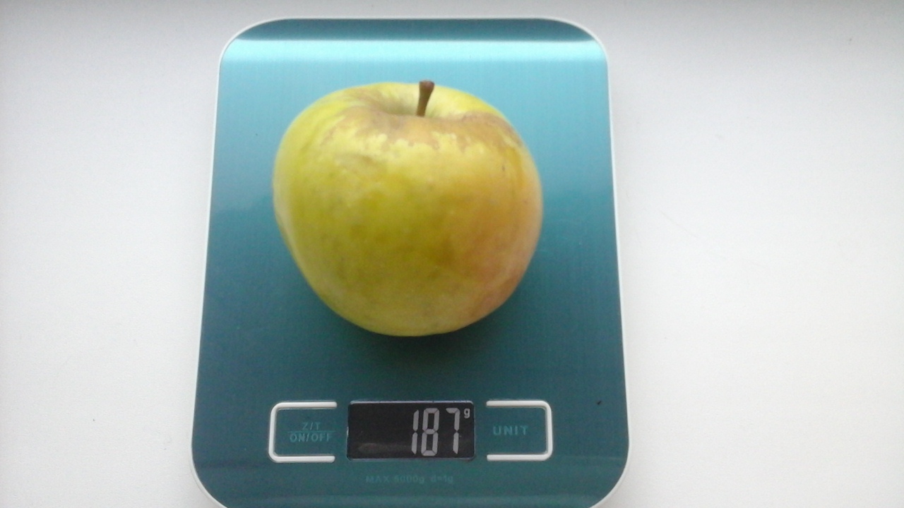 Ренет Бурхардта (первое плодоношение, 3 яблока, сняли с дерева 15 сентября). По-моему, красивое яблоко, вес примерно 250 граммом. Внешний вид несколько портит выраженная оржавленность. Вероятно, яблоко 15 сентября достигло своих оптимальных кондиций. Мякоть плотная, вполне себе сочная (но не сравнится по этому показателю с Рождественским). По вкусу наши с женой мнения разошлись. Мне вкус показался приятным и сбалансированным: нет раздражающей кислоты, но совсем не пресное и в меру сладкое. Сравнивали с Вильямс Прайд - ВП, конечно, более сладкое. Жена неожиданно сказала: "Никакое по вкусу". Пожалуй, действительно, нет каких-то отличительных ноток во вкусе, но оценку 4.3-4.4 я бы поставил тем яблокам Ренета Бурхардта, которые мы попробовали в этом году.