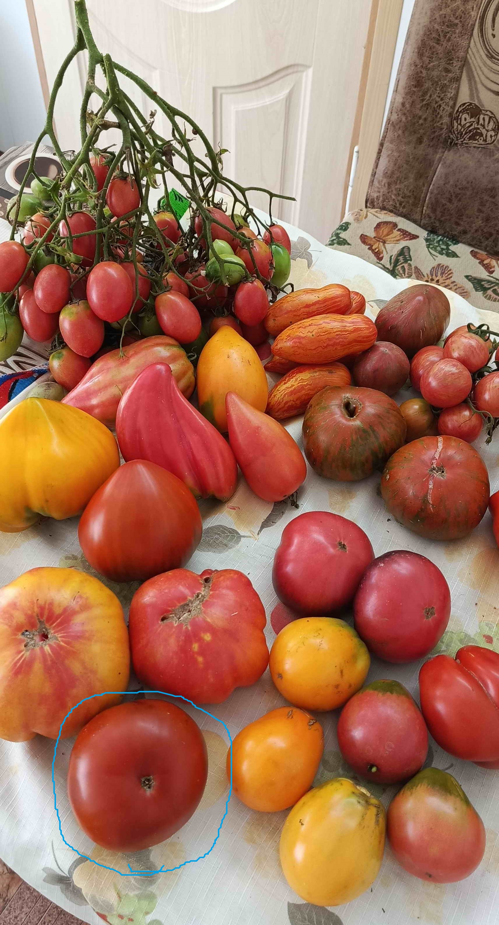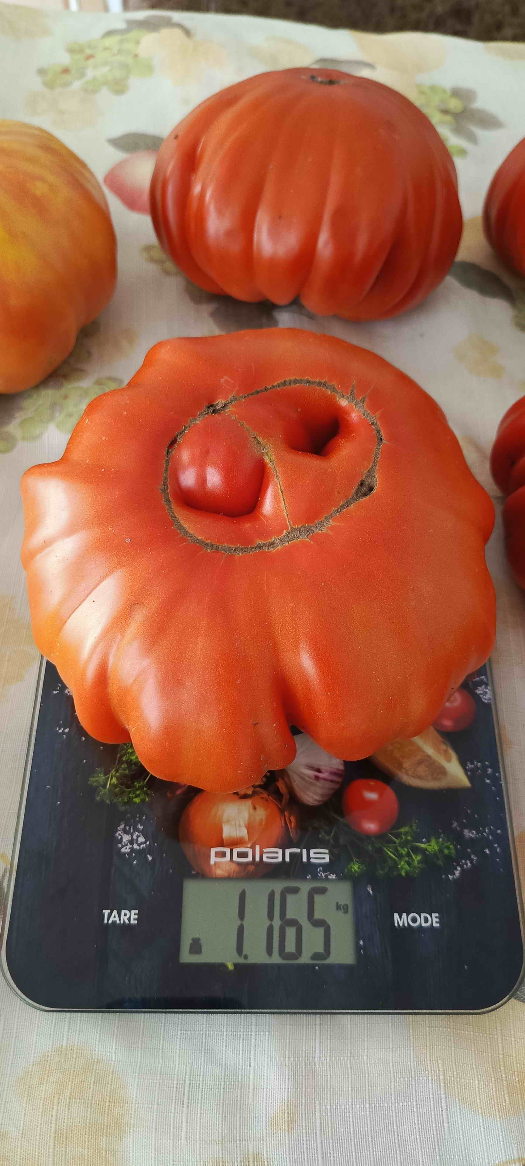 Алтайский богатырь. Первый плод выдал 10 июля, но потом был большой перырыв. Первый плод был и самым вкусным, потом у сорта пошли желтые плечики и сильно трескался. Еще недостаток в жару не вязал. Формировкав один стебель выдала 3 кисти, два пропустила. Формировка в два стебля дала 6 кистей. Плоды крупные, мягкие. Сорт для хорошей агротехники, у нас не очень хорошо показал.