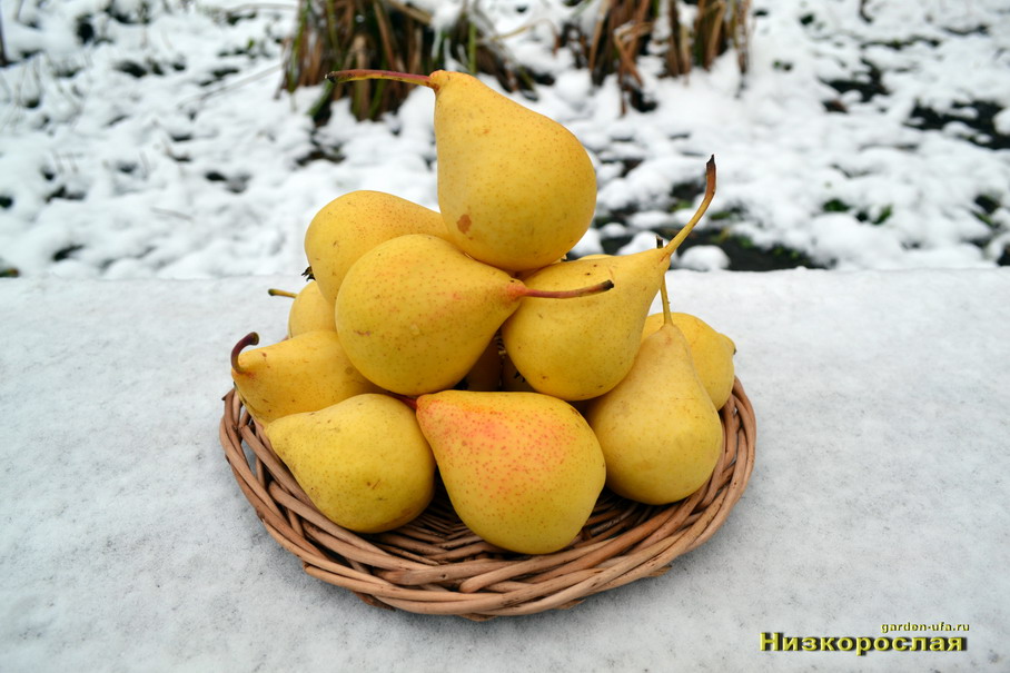 Мякоть по свойствам напоминает скорее "китайскую" грушу Невеста. Она хрустящая, сочная. Вкус кисло-сладкий. Но не слишком насыщенный. У Низкорослой имеется своеобразный привкус. И она этим интереснее.