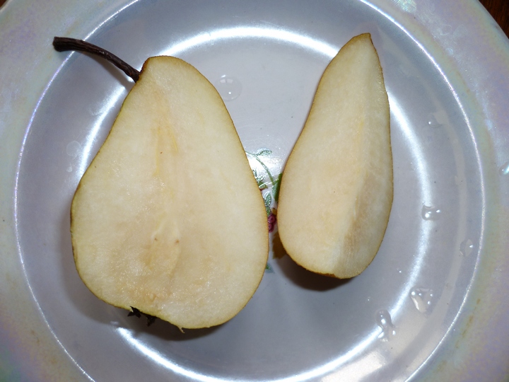 Хотел дать полежать подольше сигналке Криковской,но мои домочатцы боюсь слопают,уже так слопали Паву и ещё несколько сигналок других сортов,так что провёл дегустацию,хотя эта груша способна лежать долго,по крайней мере как положил её месяц назад в холодильник,так и осталась.Вкус у неё не хуже Конференции,мякоть в