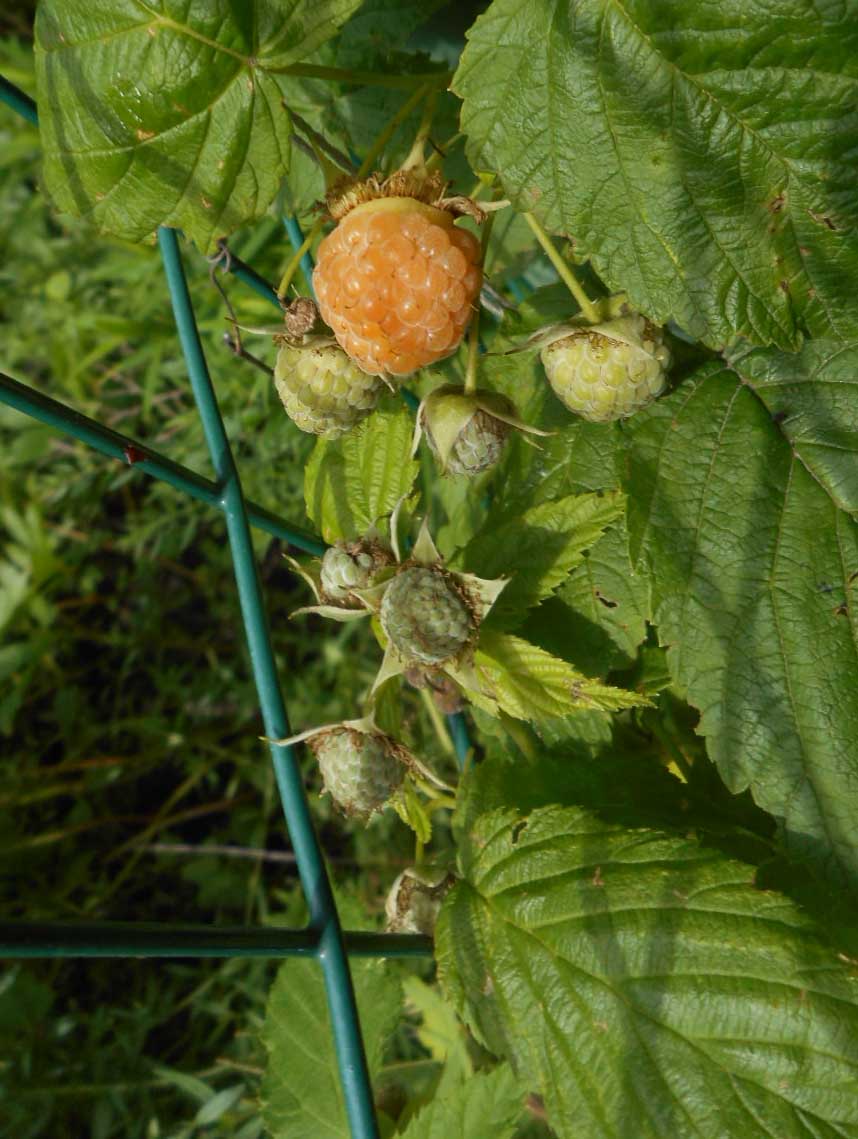 Летние малины пока вообще по нулям. Ягода ещё мелкая, продолжается цветение. Единственный из летних Гигант Московский начал зреть.