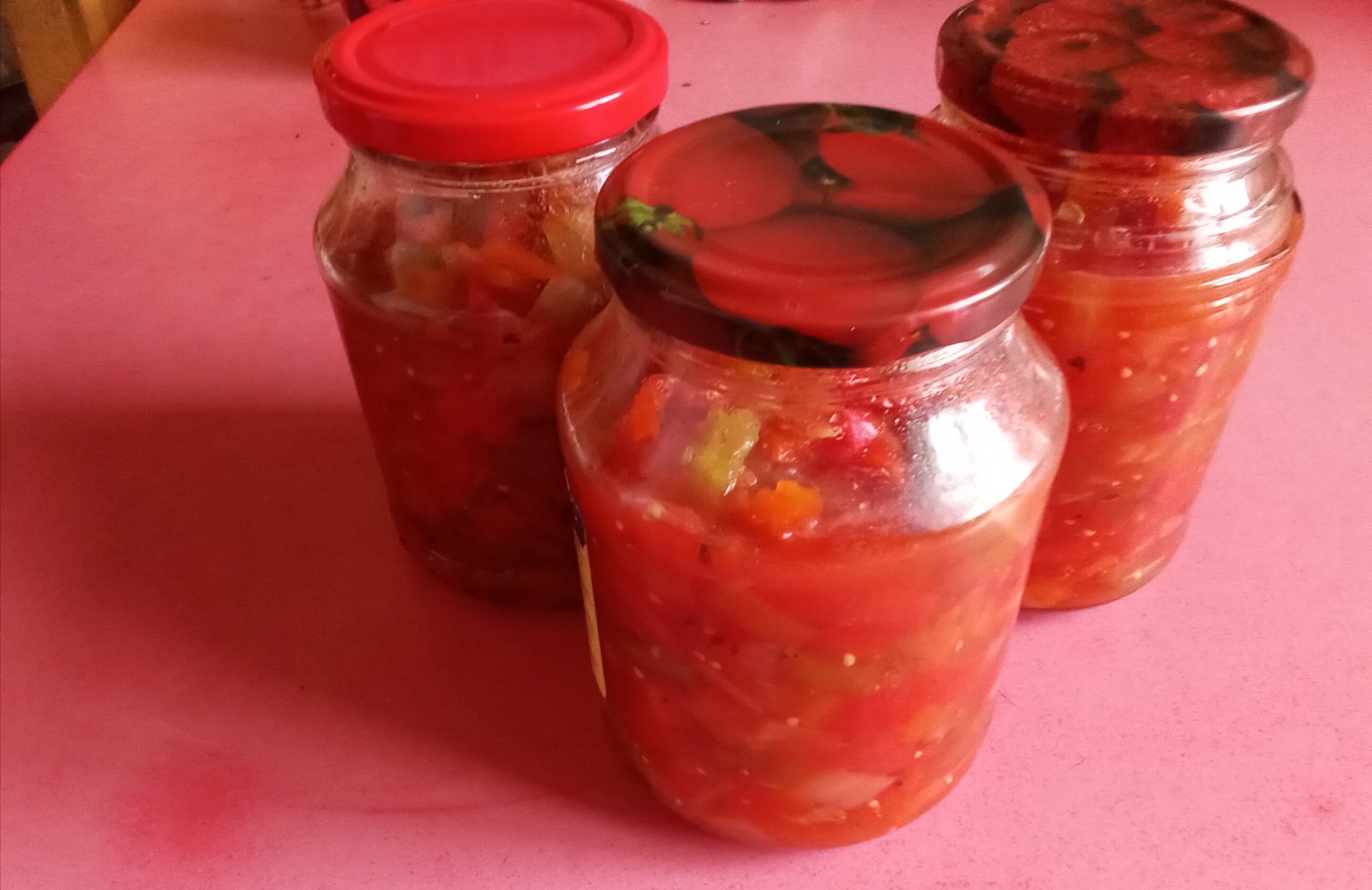 Зрелый мясистый перец вымыть, удалить плодоножку с семенами, нарезать полосками 5-8 м или кусочками. Томаты вымыть, удалить плодоножку, нарезать ломтиками толщиной 3-4 мм. Лук репчатый очистить, мелко измельчить. Подготовленные овощи переложить в кастрюлю, перемешать, влить немного воды(1 кг смеси - 30 мл воды). Тушить при закрытой крышке на умеренном огне 15 мин.Добавить соль и специи. Горячую массу плотно, без воздушных пузырьков, уложить в банки.