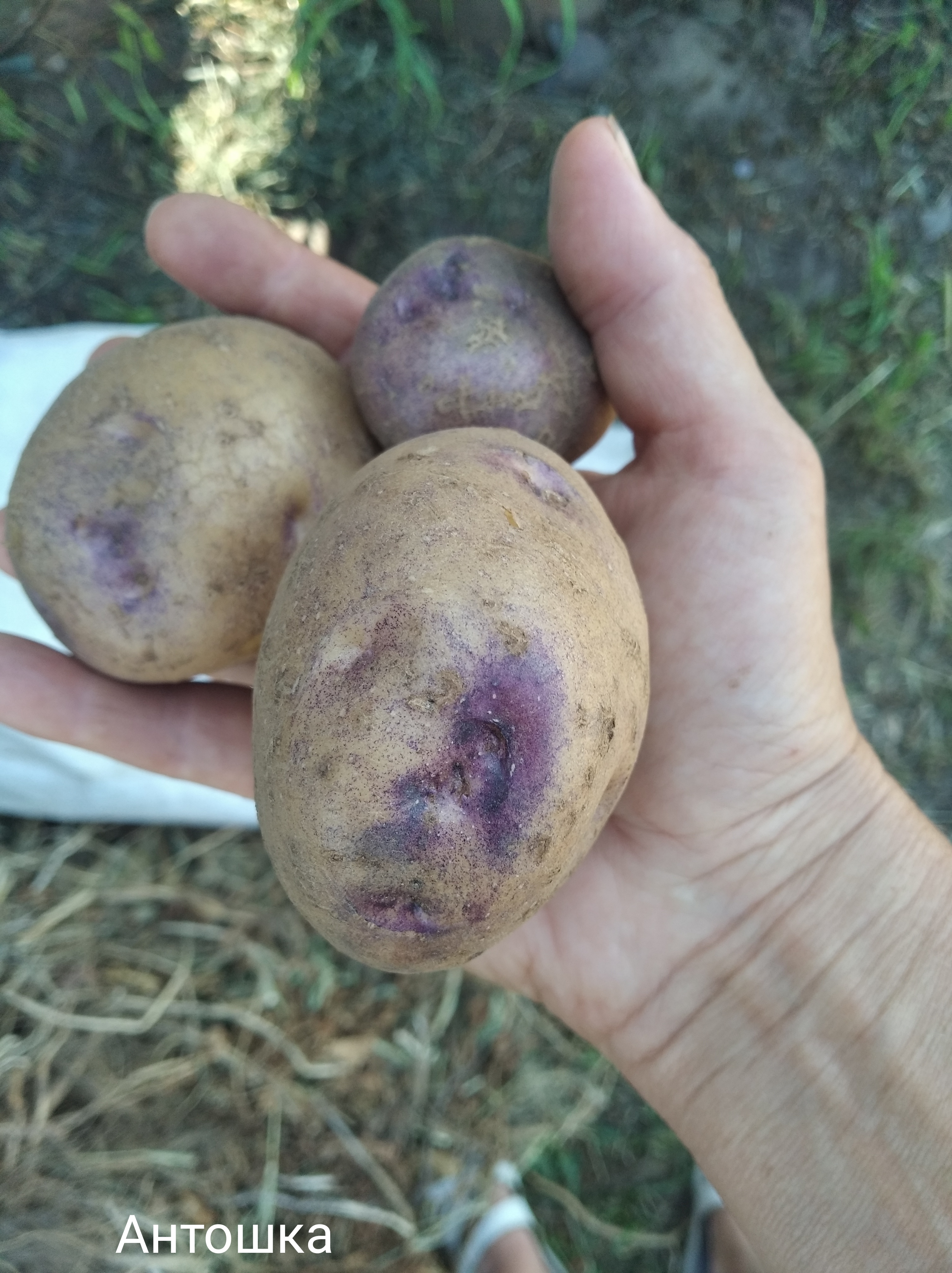 Голубизну выкопала, поприличнее Синеглазки, покрупнее...легко копается, клубни все наверху и вокруг ствола. Но не ровные, есть очень крупные, а есть совсем мелочь.