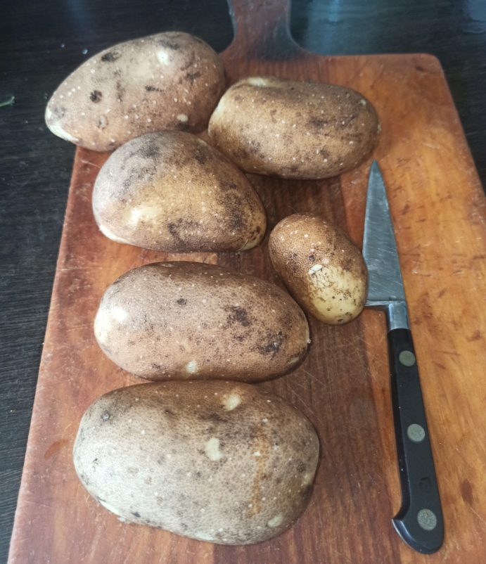 Попался в грядке "остатков посадочного материала" один куст картошки с белой мякотью (это, скорее всего, сорт с неизвестным названием, который мы сажаем на протяжении многих лет, либо Никулинский). Клубни уже хорошего товарного размера, мелочи нет. Ботва еще зеленая, но развалилась, и кончики листьев начали чернеть. Думаю, что дней через 10 надо будет убирать и этот неизвестный сорт, и Никулинскую. Хотя обычно Никулинскую мы убираем где-то в первой декаде сентября.