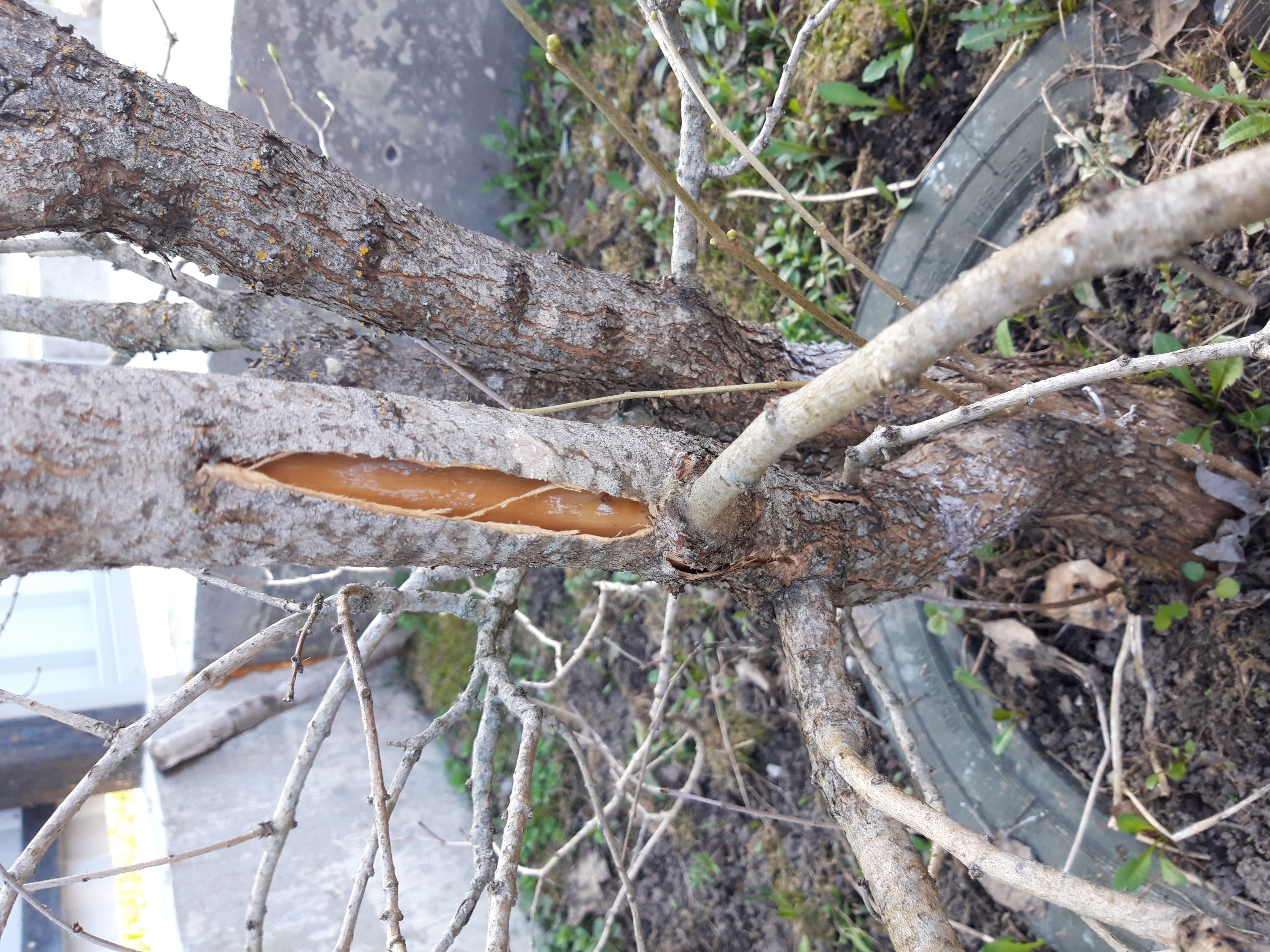 Подскажите в чем может быть причина разрыва коры сирени? Разрыв довольно свежий.