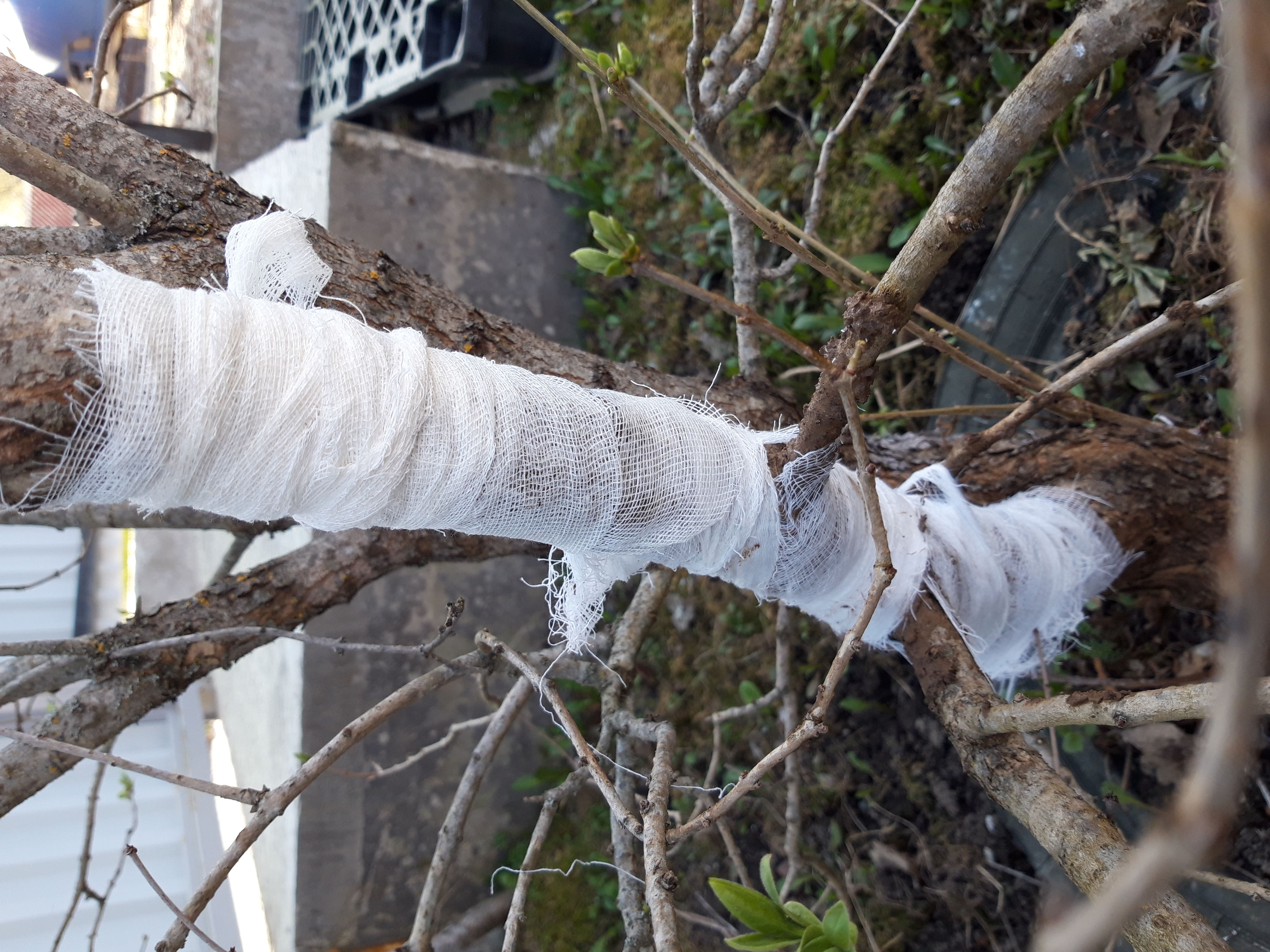 Может, сук изогнулся под тяжестью снега, приподнял, выпучил кору, что над ним. Поэтому она в направлении силы и лопнула. но по побуревшему цвету заболони можно предположить, что солнечный( или солнечно-морозный) ожог уже был. А что за белые мазки на поверхности заболони? Побелка? В худшем случае - грибница. Перед повязкой, надо было рану продезинфицировать. Хоть медным купоросом, хоть марганцовкой.