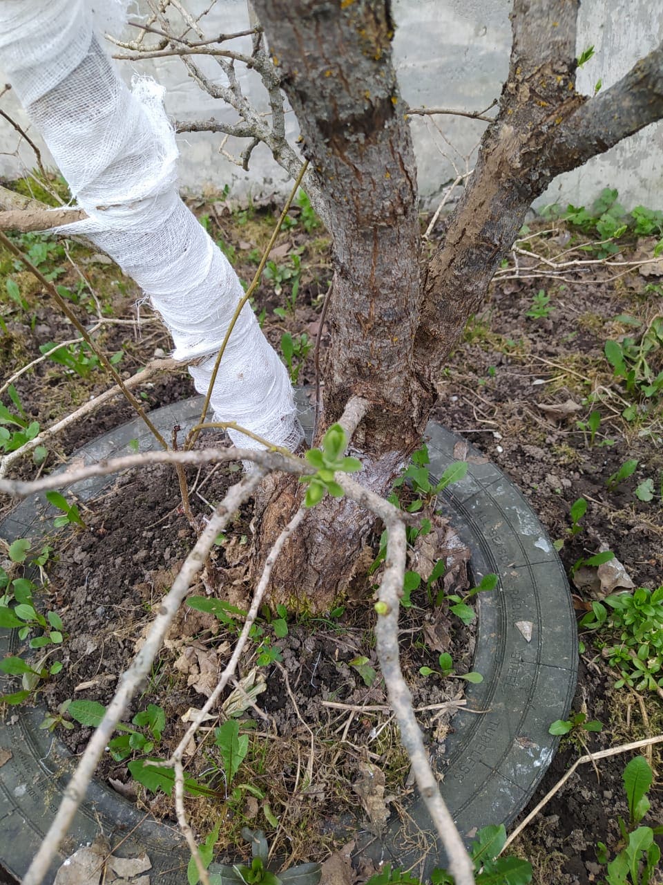 Дерево внешне здоровое, прирост есть. Поросль никогда не давала. Растет в три развилки. Дует почки на всех побегах в т.ч. и на той что повреждена.