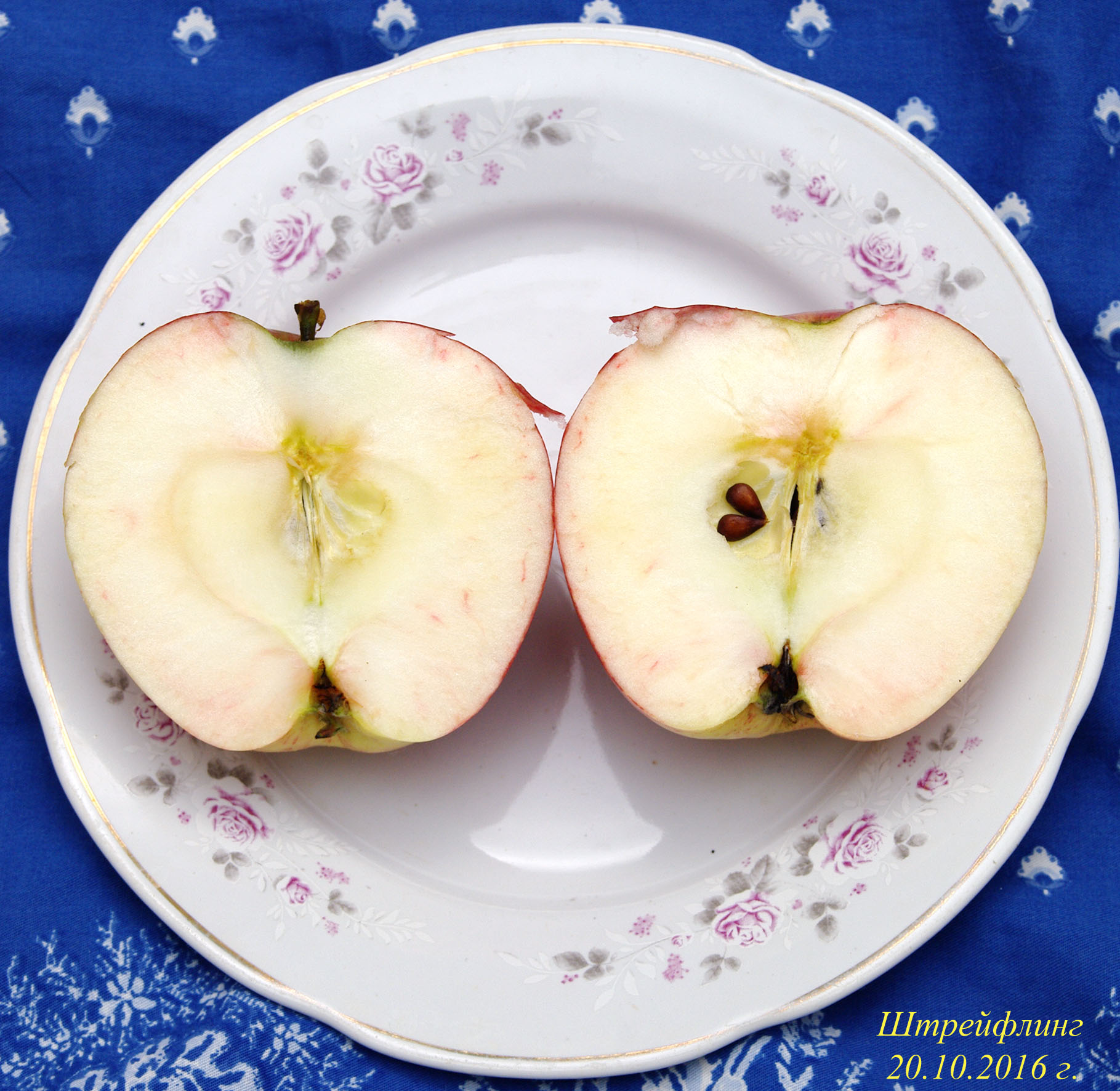 Вообще-то у меня обычно съемная зрелость Штрейфлинга наступает где-то во второй декаде сентября (конечно, в зависимости от того, какое лето). Но этот год какой-то странный - зимние сорта рано созрели, а вот Штрейфлинг даже чуть позднее. По части мякоти - она при съеме достаточно плотная, а потом довольно быстро рыхлеет, становится "картошкой", да и вкус при этом тоже сильно страдает. А вкус с дерева очень хороший, гармоничный кисло-сладкий с винным привкусом, но продолжается это недолго, за что я этот сорт не очень уважаю. Помню в детстве в деревне у соседа было несколько деревьев Штрейфлинга, но яблоки были немного другие - цвет темно-красный, окраска более равномерная, полосы менее выражены, мякоть плотнее, и хранились они дольше - месяца два. Ну и вкус казался лучше (вероятно, как и все в детстве). Потому и посадил Штрейфлинг в 1980 г (после страшной зимы 78-79 гг., когда многое померзло). Когда же заплодило моё дерево, увидел, что яблоки несколько другие, хотя сомнений нет, что это именно Штрейфлинг.